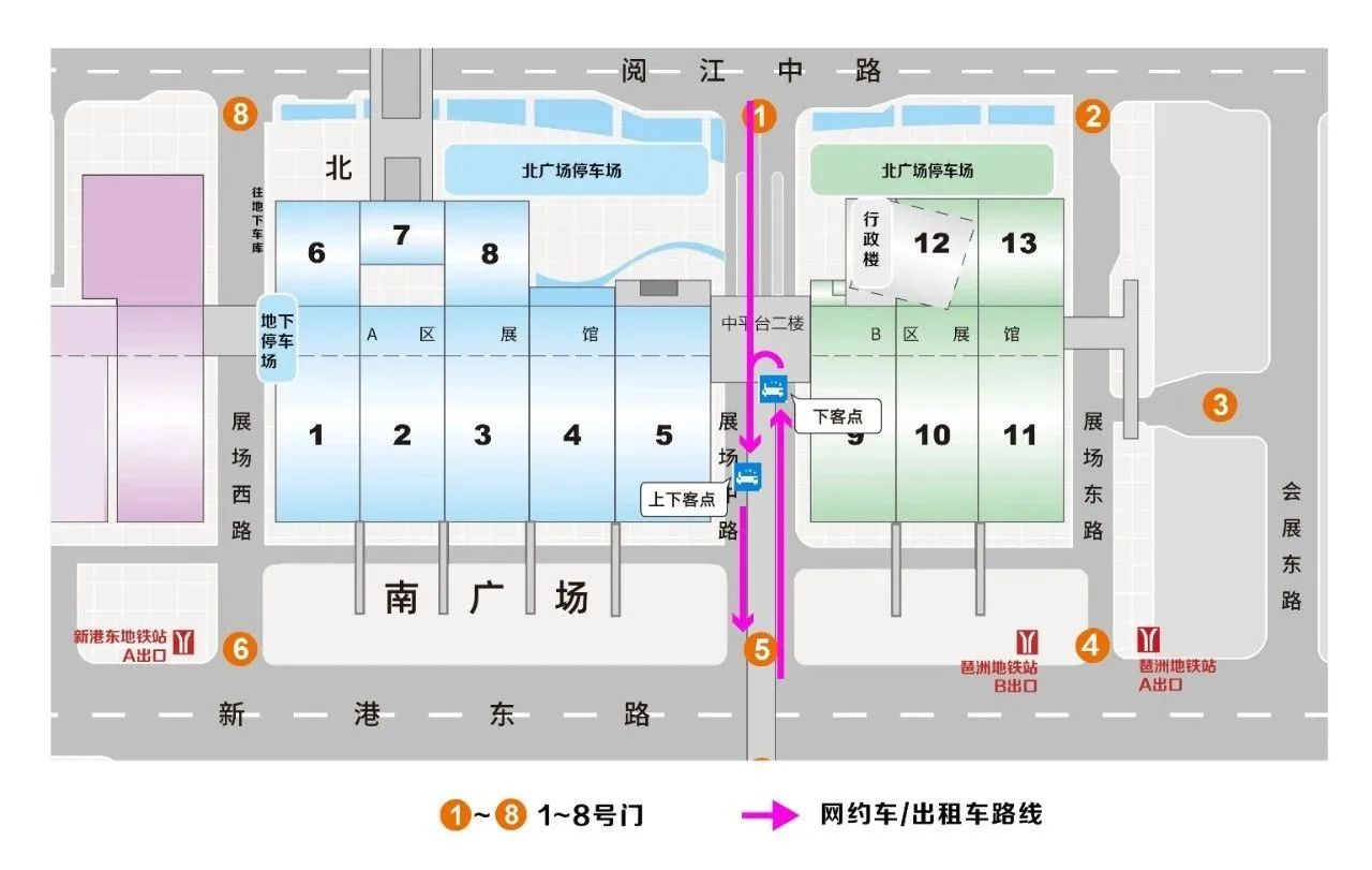 展馆A区:定位广交会展馆8号门。从阅江中路驶入,沿展场西路驶至斜坡处下地库或北广场停车场。
